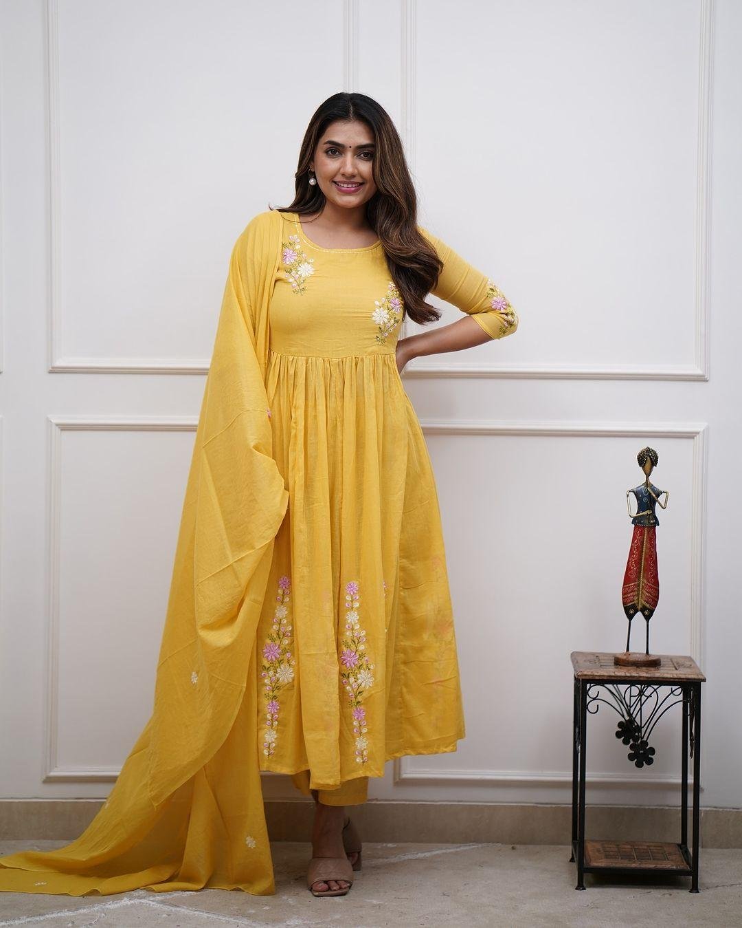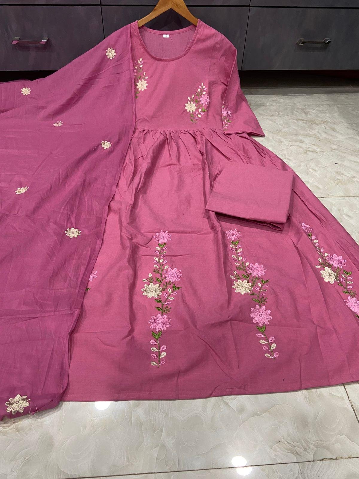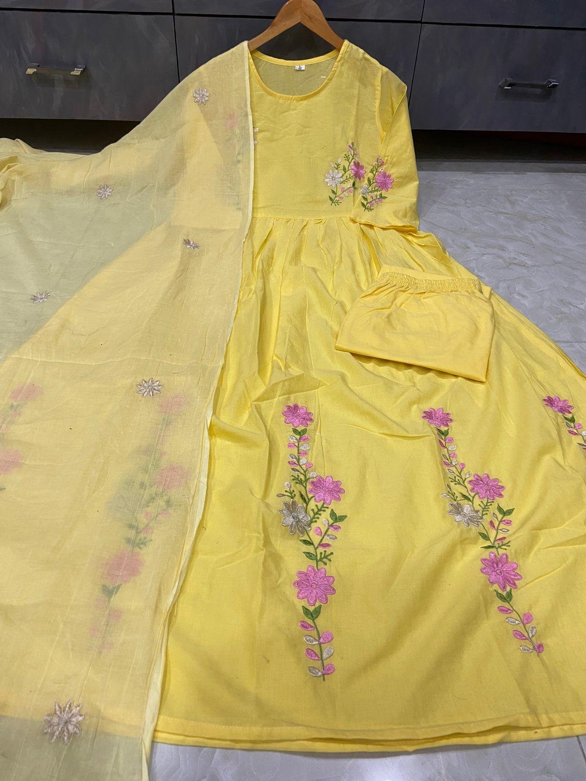 ◼Yoke And Sleeves Anarkali Kurti Paired With Pant And Embroidered Malmal Dupatta suit set