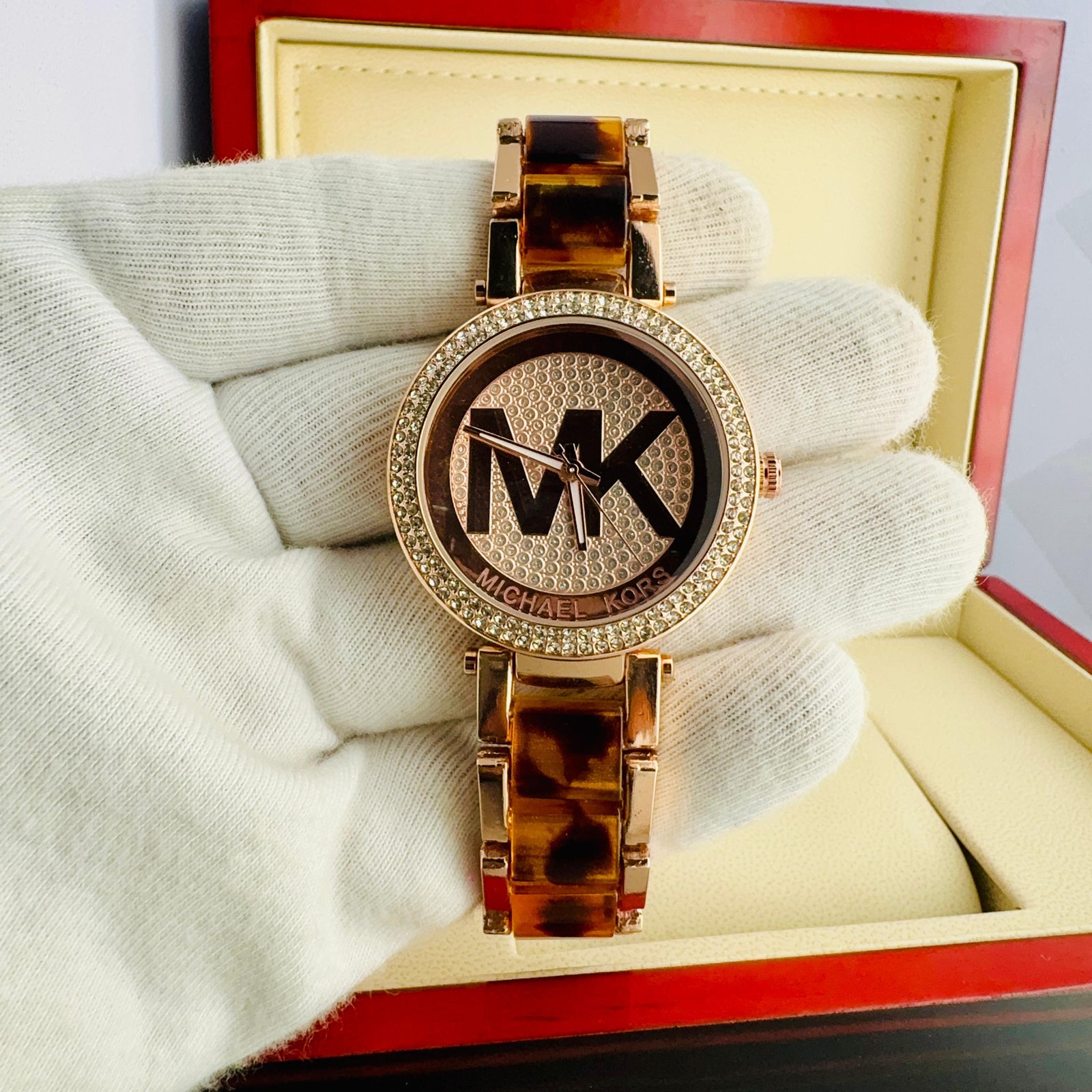 * MK Logo Zoom Dial With Diamonds Ring On Dial And Premium Quality Metal Strap With Butterfly Lock